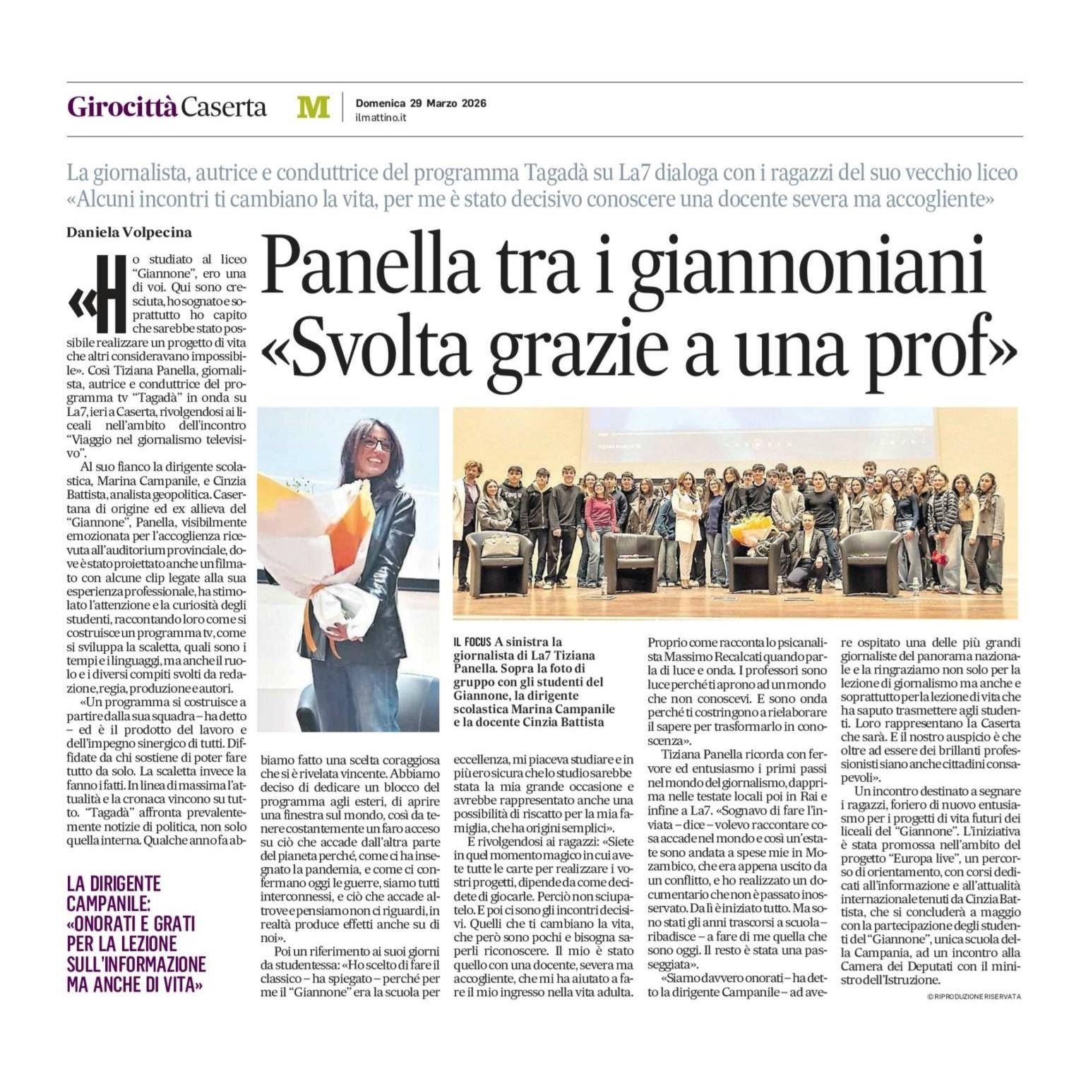 'Ho studiato al Liceo Giannone, ero una di voi. Qui sono cresciuta, ho sognato e soprattutto ho capito che sarebbe stato possibile realizzare un progetto di vita che altri consideravano impossibile.' Così Tiziana Panella, giornalista, autrice e conduttrice del programma TV Tagadà n onda su La7, ieri a Caserta, rivolgendosi ai liceali nell'ambito dell'incontro 'Viaggio nel giornalismo televisivo'...
